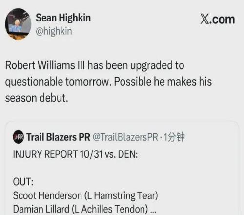 據開拓者方面的消息,羅伯特-威廉姆斯已經傷愈復出,近期回歸。如果羅威回歸了,對于楊瀚森來說是一個壞消息,楊瀚森的出場時間會更少!