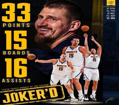 上一場比賽,掘金主場122-112力克熱火,約基奇交出了賽季至今個人最好的表現:全場出戰36分鐘,投籃18中12,三分5中2,罰球8中7,得到33分15籃板16助攻3搶斷。